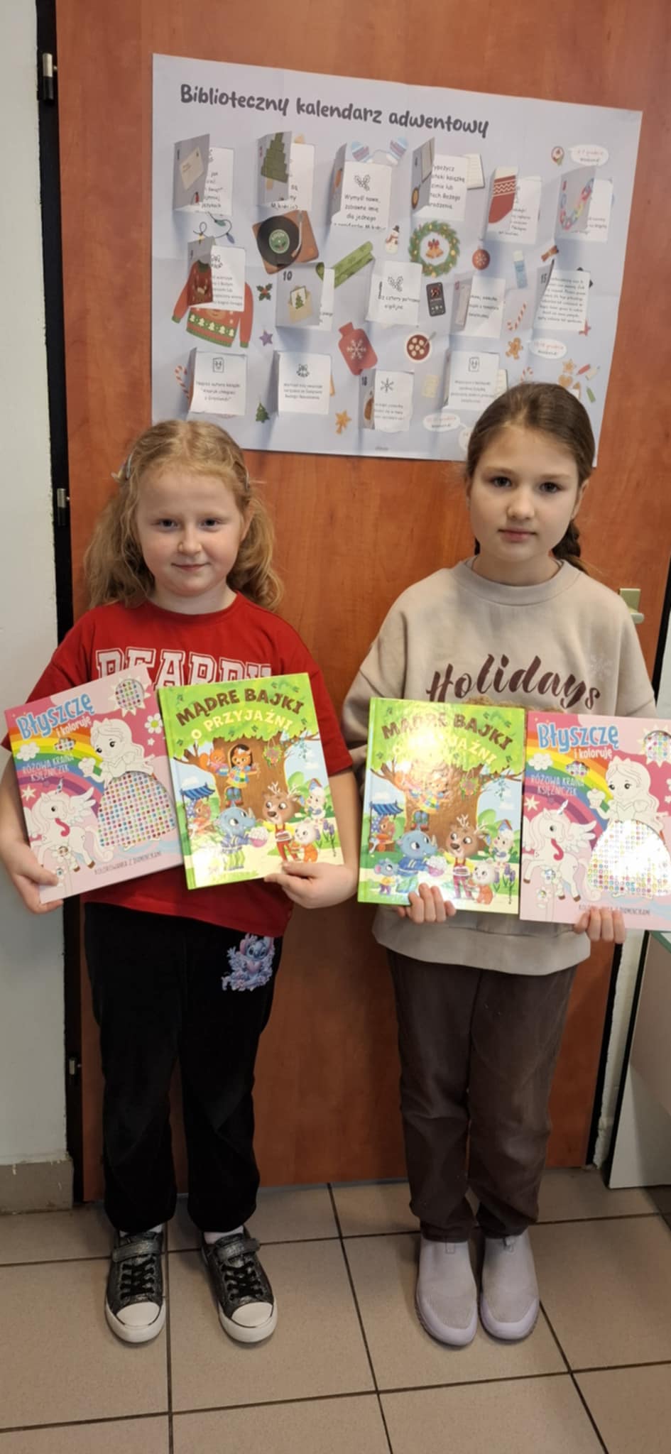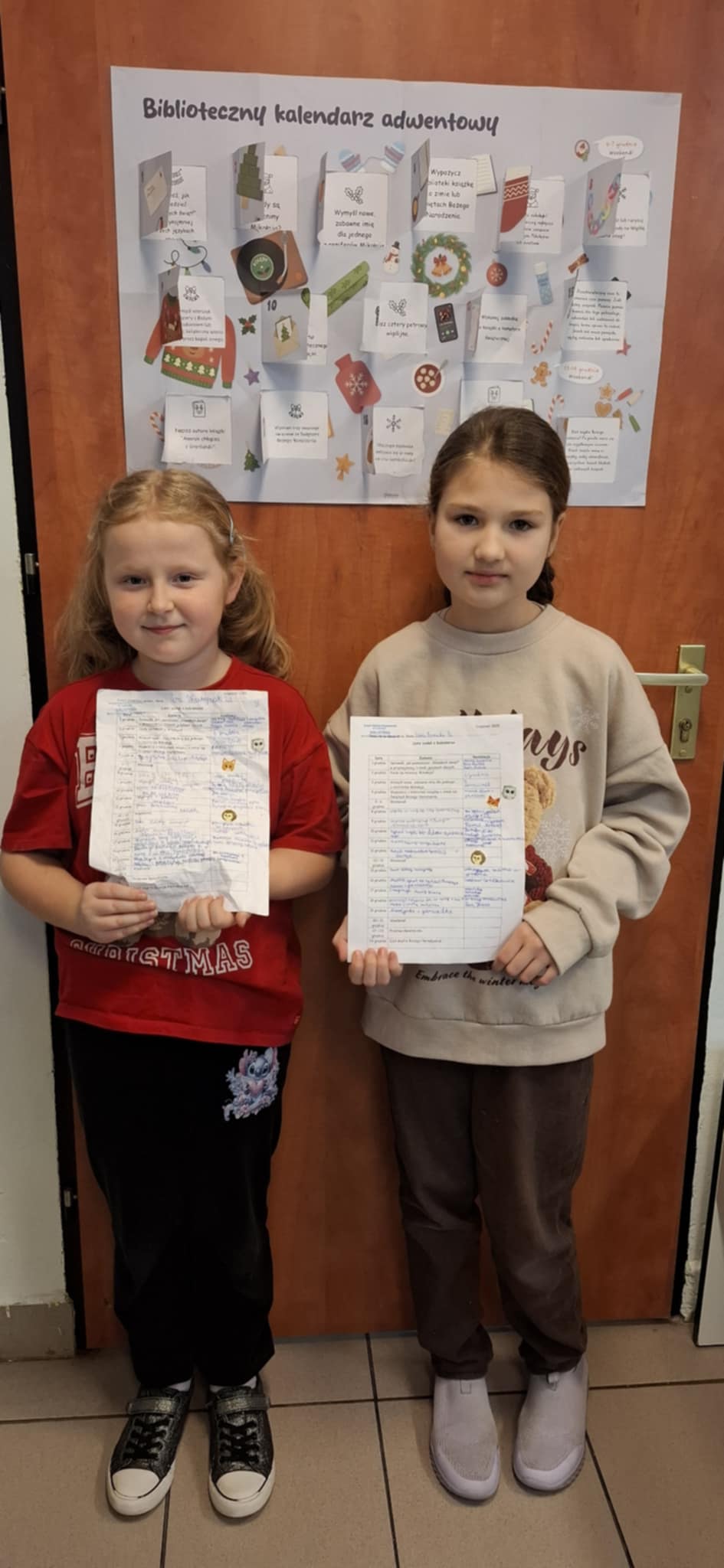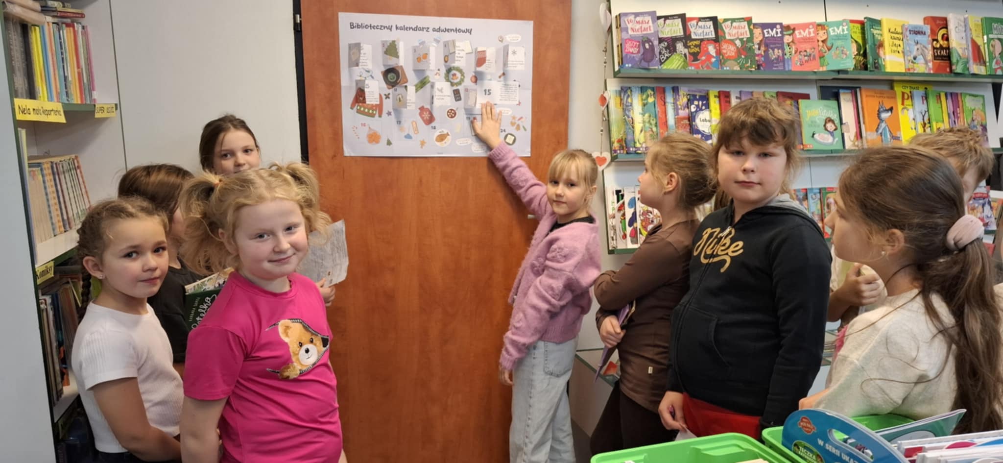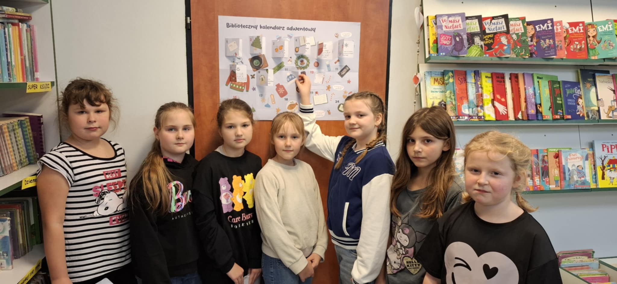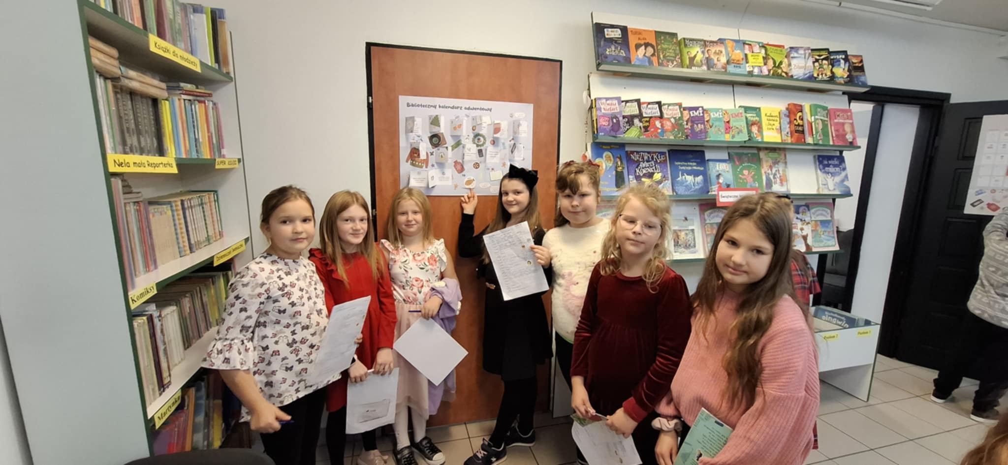 W miesiącu grudniu zorganizowano konkurs Biblioteczny Kalendarz Adwentowy. Zabawa polegała na realizowaniu wyznaczonych zadań w okresie adwentu czyli od 1 do 24 grudnia 2025 r. Codziennie, wspólnie z uczniami odkrywano kolejne zadania, które miały charakter zarówno świąteczny, jak i były zachętą do podjęcia działań związanych z książką i czytaniem. Wyzwania dotyczyły m. in. zaprojektowania kartki świątecznej z życzeniami, wykonania świątecznej zakładki lub ilustracji, napisania listu do Świętego Mikołaja, zapoznania się z tradycjami i zwyczajami adwentowymi i bożonarodzeniowymi. Trzeba było również wypożyczyć, przeczytać i opowiedzieć książkę związaną ze świętami. W konkursie tym wzięło udział 20 –tu uczniów z klas II-V. Za wykonane zadania, uczestnicy zostali nagrodzeni dyplomami, książkami, zakładkami oraz słodyczami.