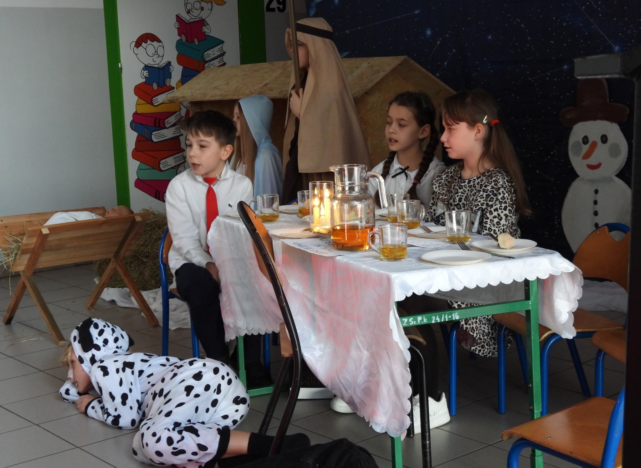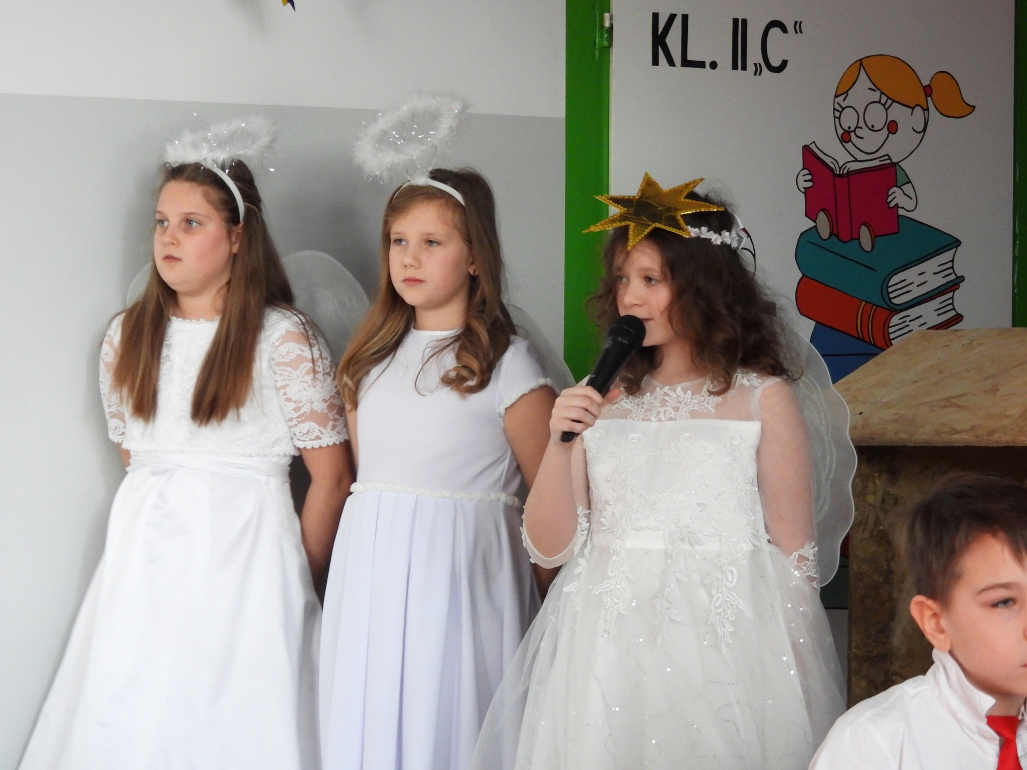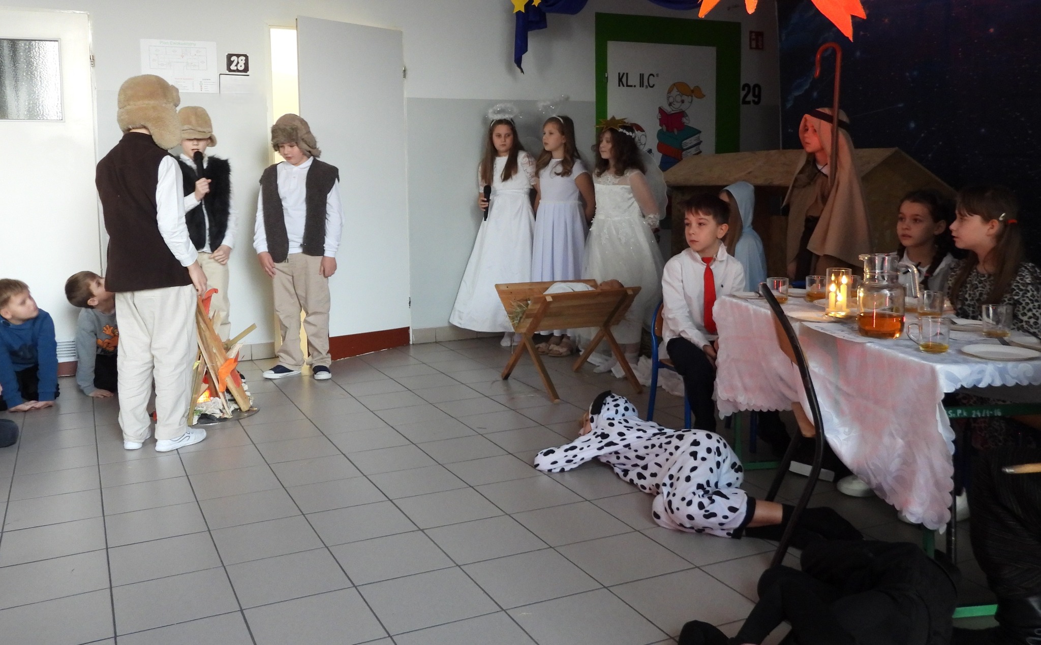 W dniu 17 grudnia, klasa III b pod kierunkiem Ewy Goliat, zaprezentowała dla klas młodszych bożonarodzeniowe przedstawienie zatytułowane "Dzieciąteczko Maleńkie". Dzieci pokazały przygotowania do wigilii, rodzinną wigilię wraz domowymi zwierzętami oraz odwiedziny Świętej Rodziny w stajence. Pokazały też, że mimo dodatkowego nakrycia zabrakło miejsca dla przypadkowych wędrowców, którymi okazali się Maryja z Dzieciątkiem, Jezus i Anioł. Gra małych aktorów, ciekawe stroje, bogata oprawa muzyczna i gra na fletach zostały wysoko nagrodzone gromkimi brawami. Na koniec przedstawienia głos zabrała Pani Dyrektor Agnieszka Bernaciak, która złożyła wszystkim życzenia świąteczne.