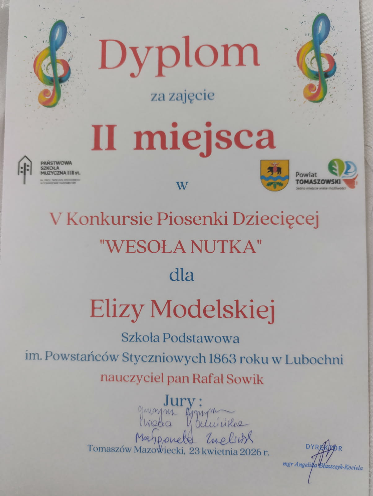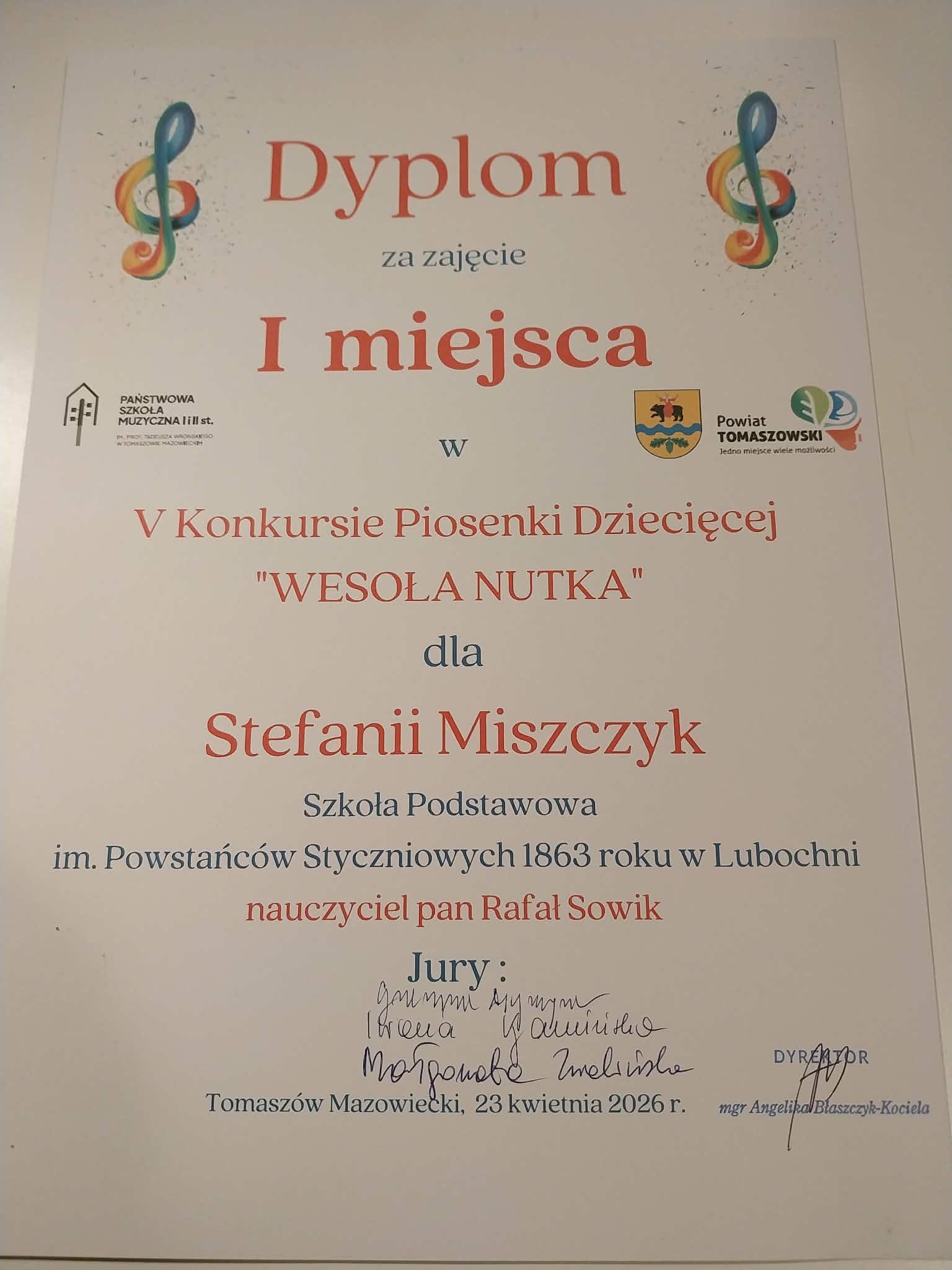 Z dumą informujemy o sukcesie naszych uczennic podczas konkursu „Wesoła Nutka”, który odbył się 23 kwietnia w Państwowej Szkole Muzycznej I i II stopnia im. prof. Tadeusza Wrońskiego w Tomaszowie Mazowieckim.