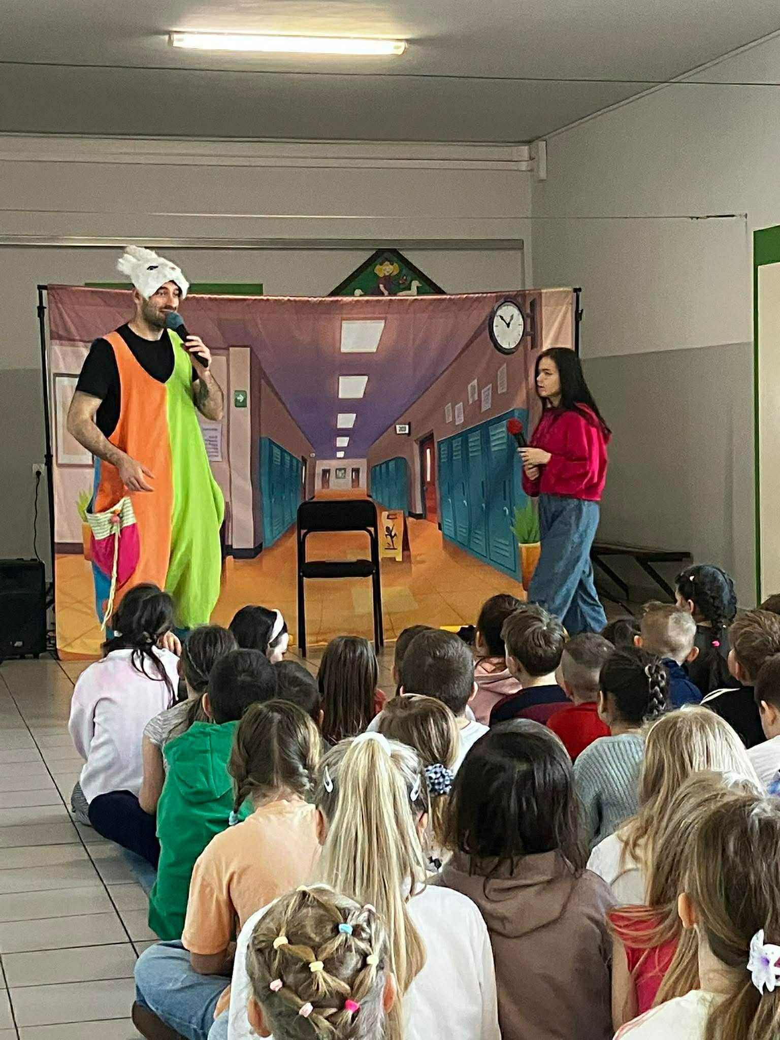 17 kwietnia w naszej szkole gościliśmy aktorów z Grupy T z Torunia, którzy zaprezentowali uczniom klas 1–4 niezwykłe przedstawienie profilaktyczne „Lord Hejter, czyli jak walczyć z czarnym charakterem”. Spektakl w ciekawy, pełen humoru i interakcji sposób poruszał bardzo ważny temat hejtu oraz jego wpływu na drugiego człowieka. Dzieci miały okazję dowiedzieć się, jak reagować na nieprzyjemne sytuacje, jak budować dobre relacje oraz dlaczego warto być życzliwym i wspierać innych. Dziękujemy aktorom za wartościowe spotkanie, a naszym uczniom za aktywny udział i wspaniałą atmosferę! Pamiętajmy – słowa mają moc!