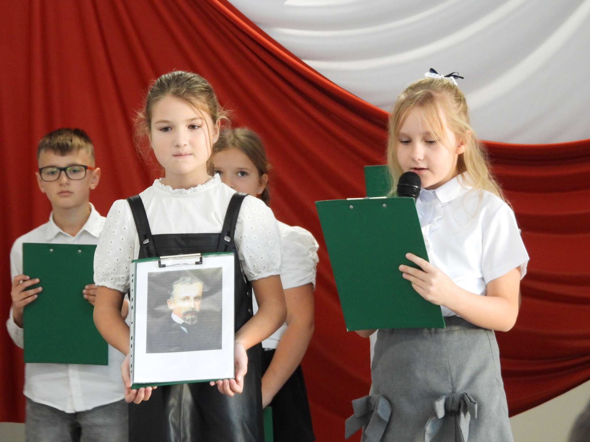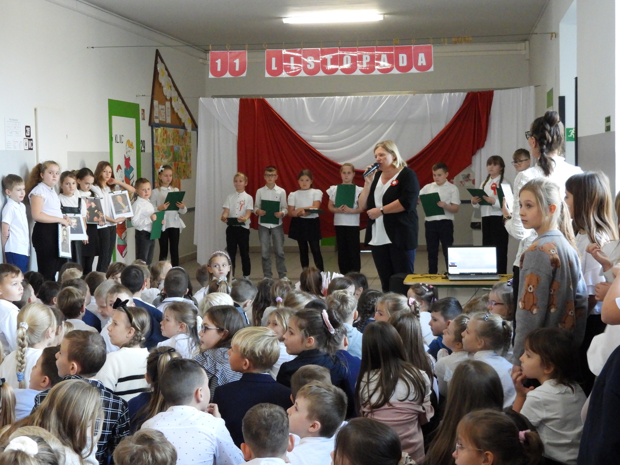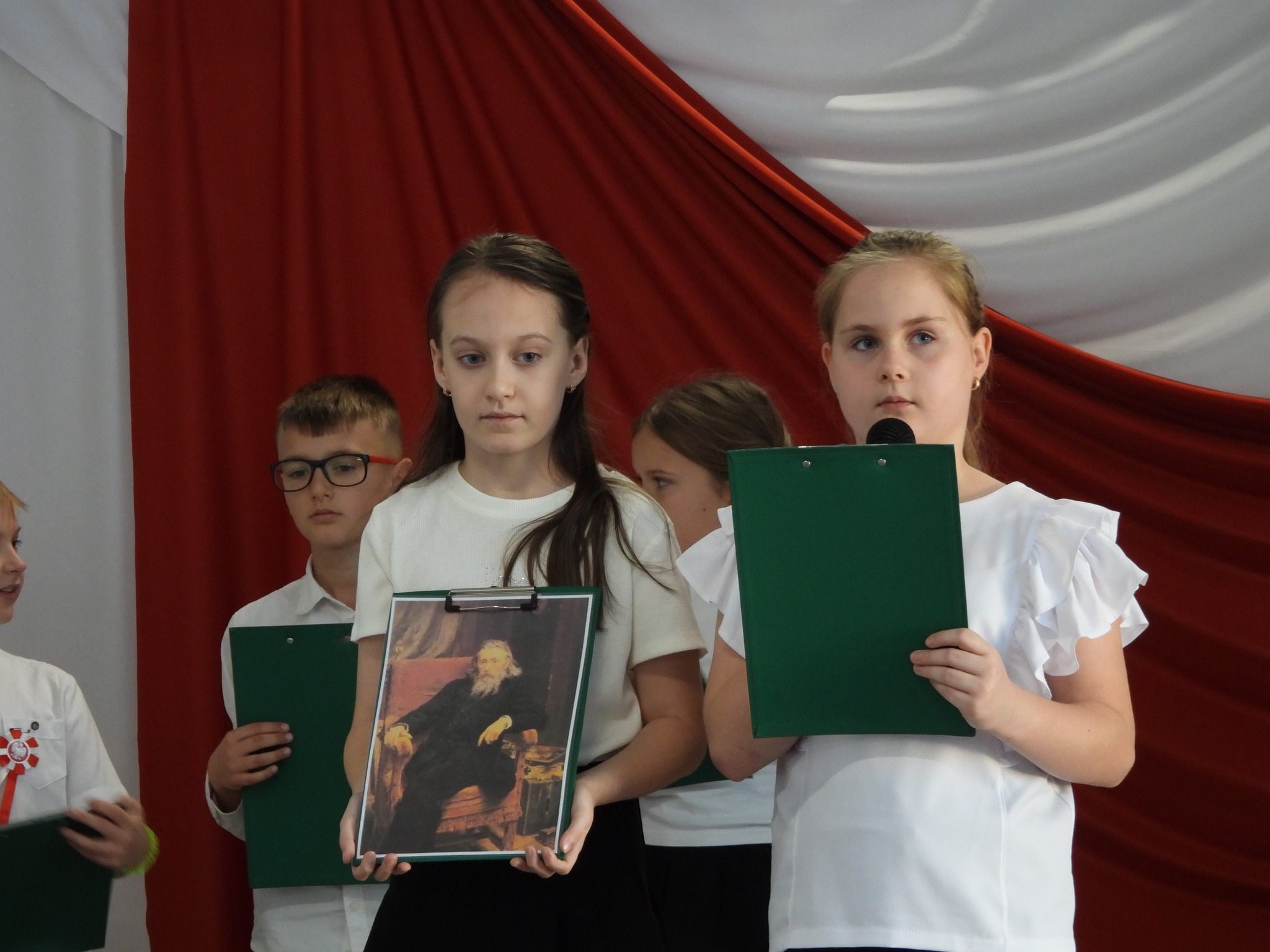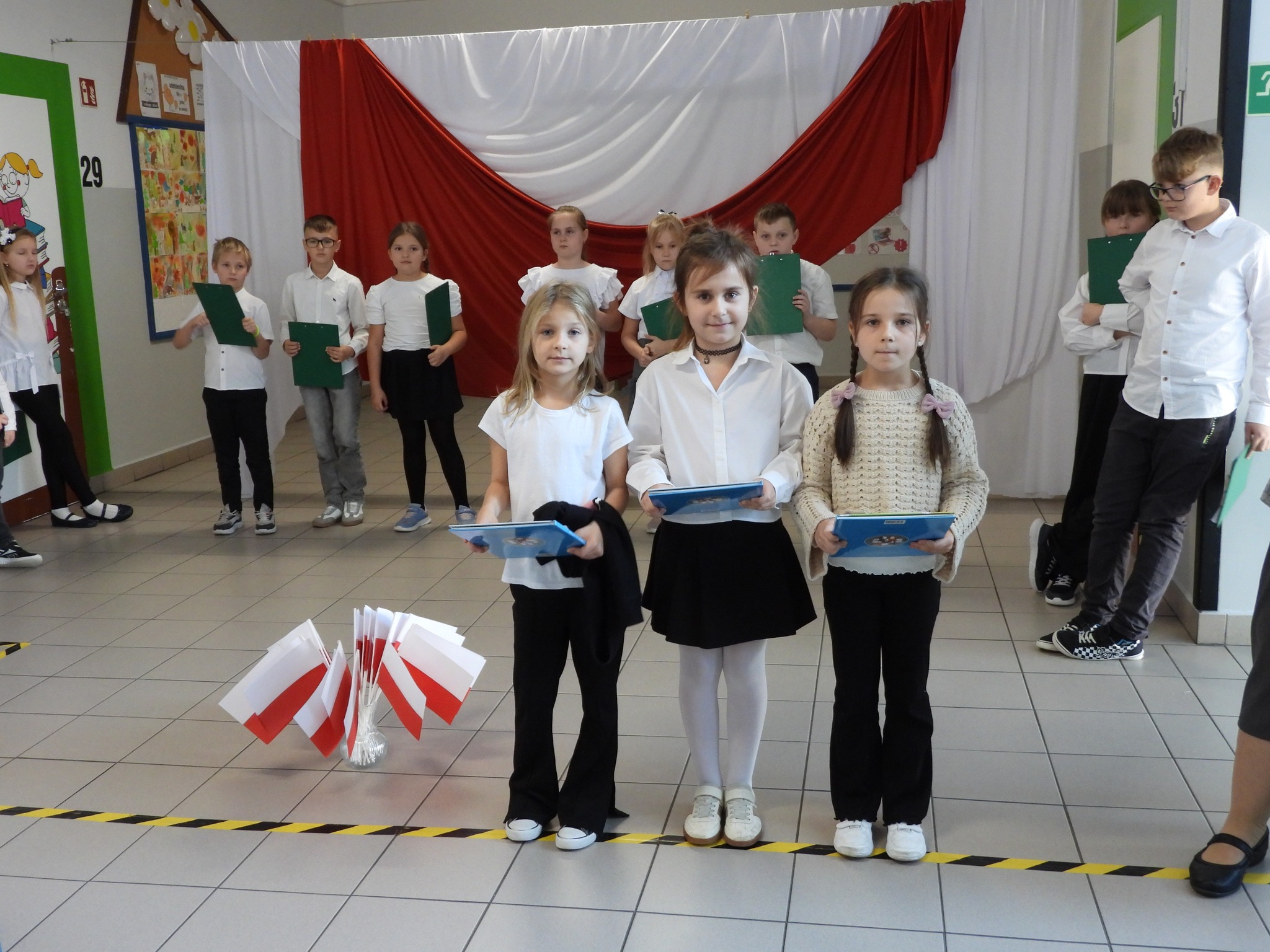 Młodsi uczniowie z wielkim zaangażowaniem zaprezentowali wiersze i pieśni patriotyczne, przypominając o ważnych wydarzeniach z historii naszego kraju oraz o znaczeniu wolności i miłości do Ojczyzny.
