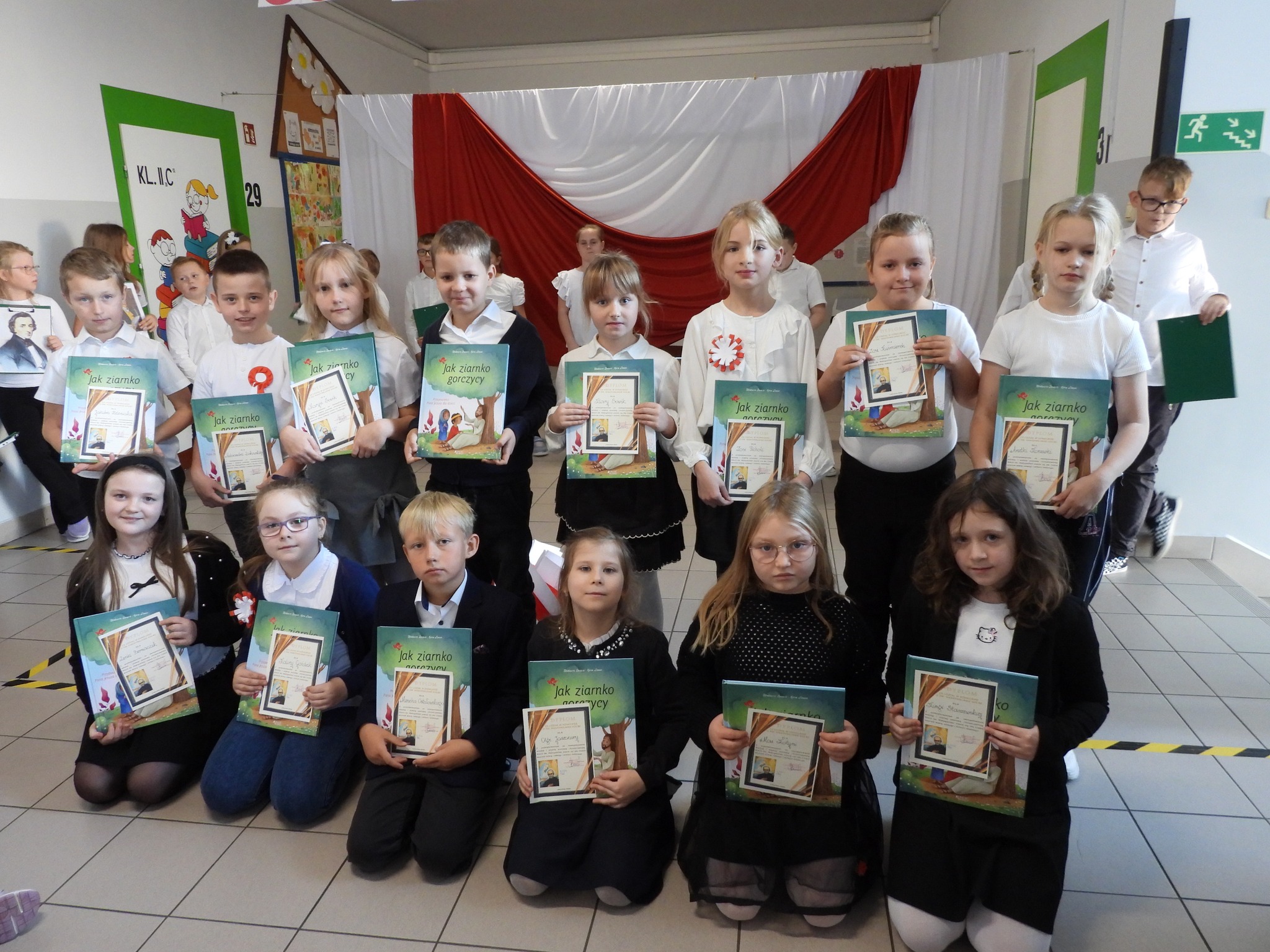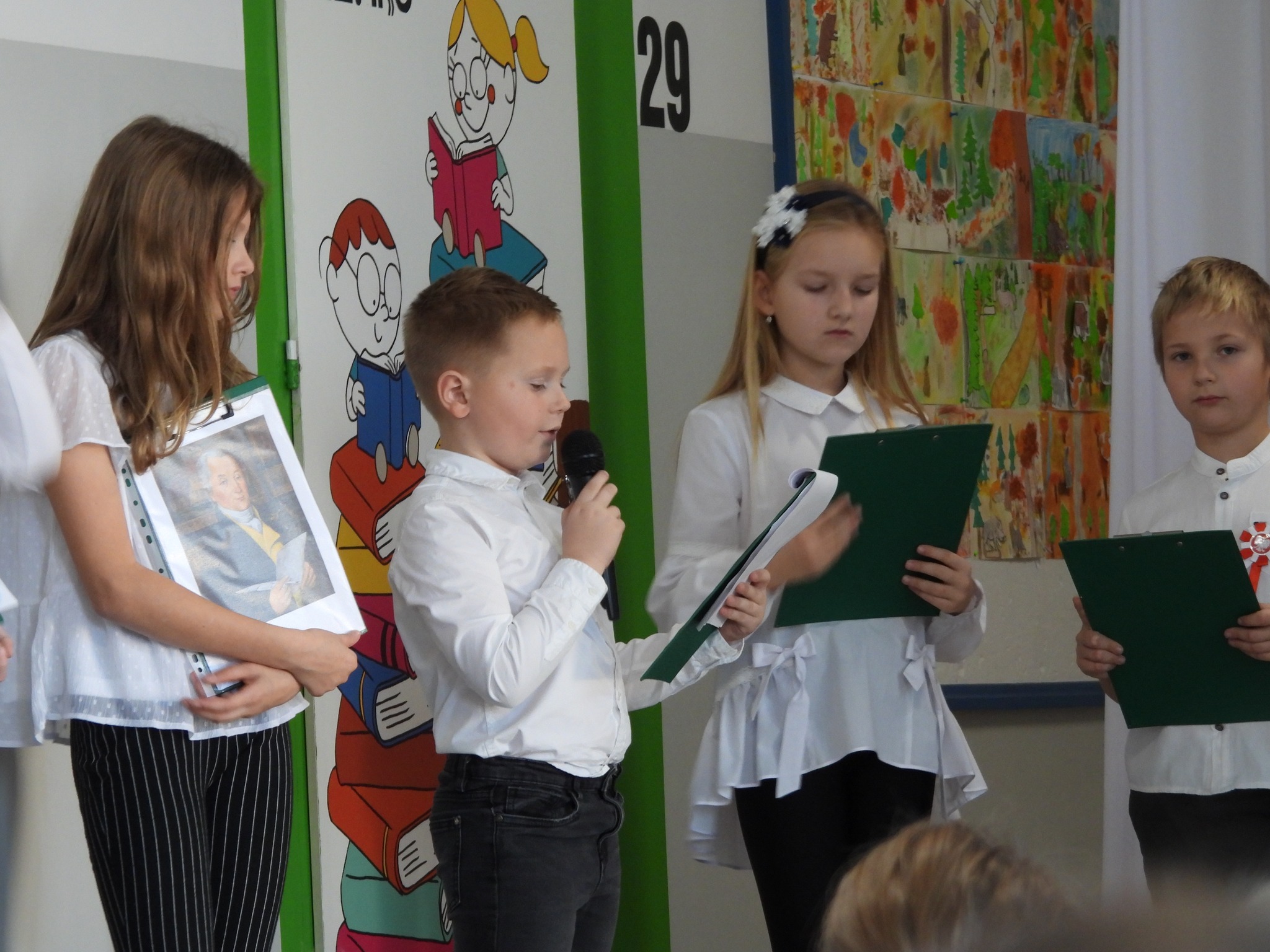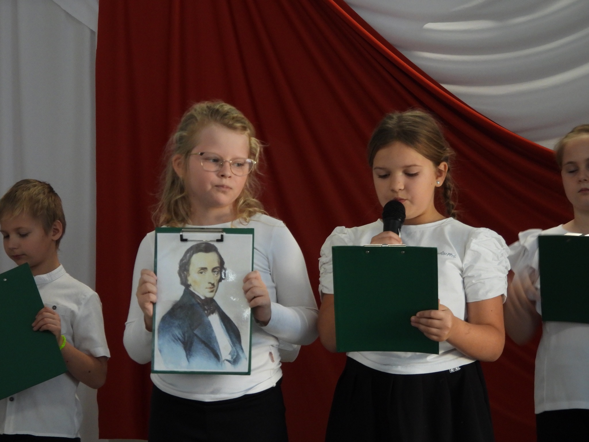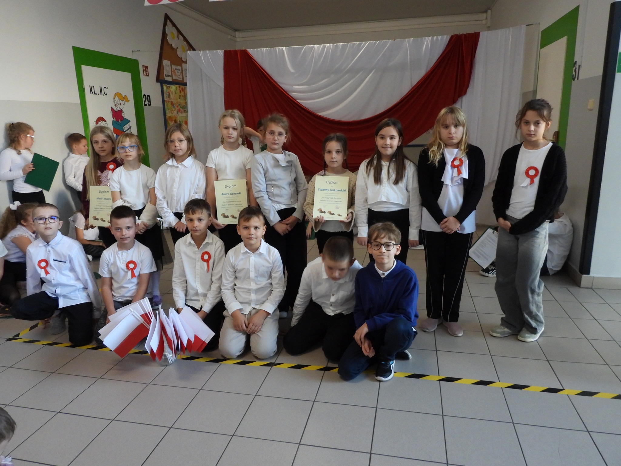 Młodsi uczniowie z wielkim zaangażowaniem zaprezentowali wiersze i pieśni patriotyczne, przypominając o ważnych wydarzeniach z historii naszego kraju oraz o znaczeniu wolności i miłości do Ojczyzny.