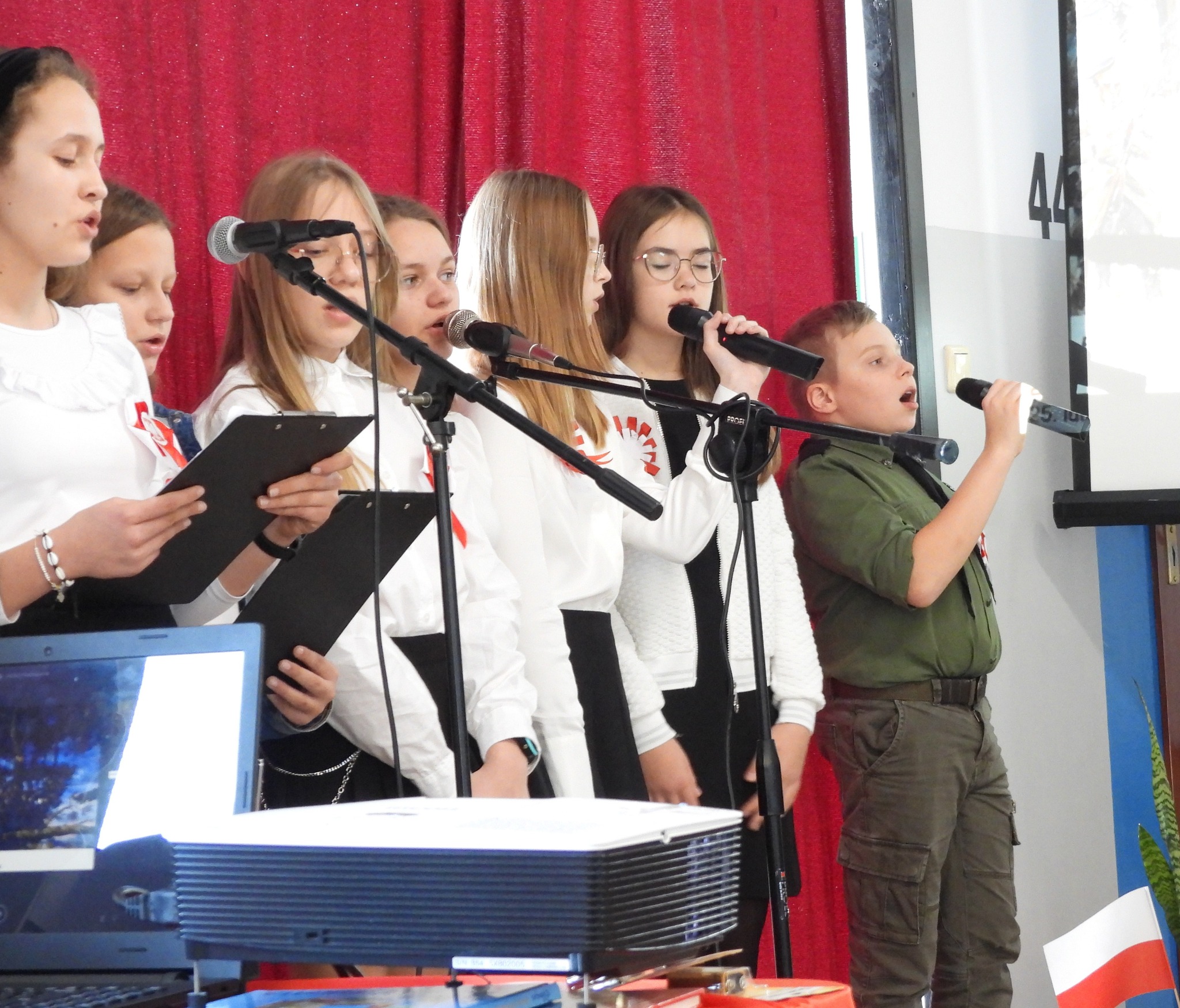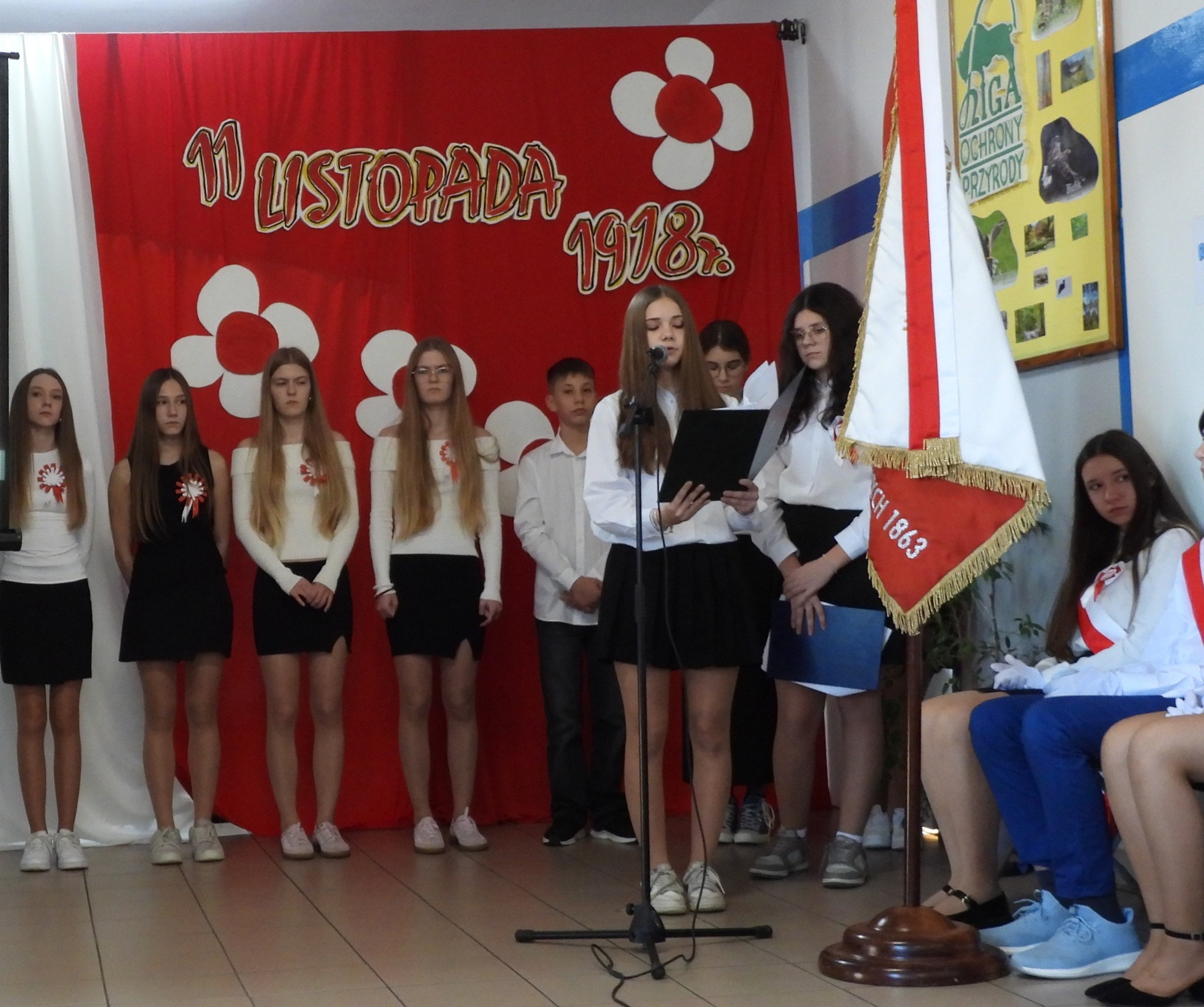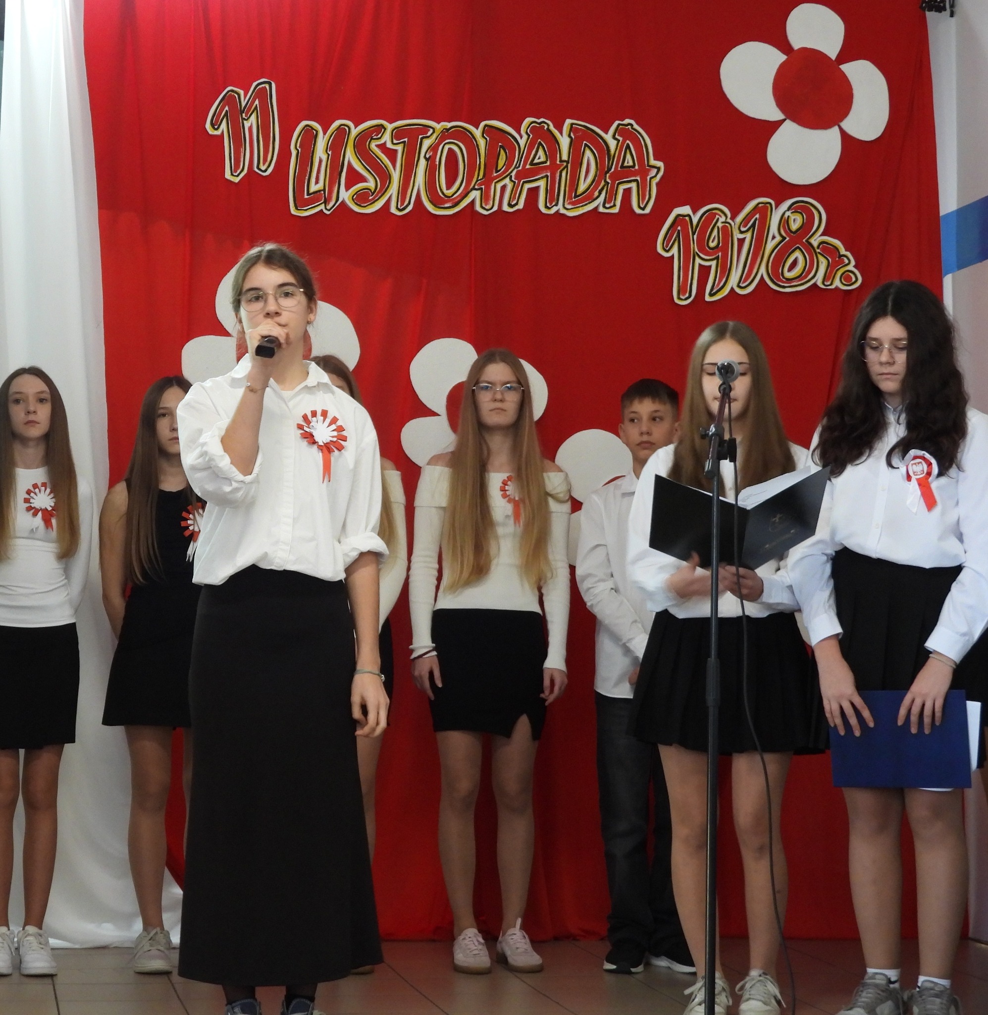 Cała społeczność szkolna zgromadziła się, aby uczcić 107. rocznicę odzyskania przez Polskę niepodległości. Uroczystość rozpoczęła się od wspólnego odśpiewania „Mazurka Dąbrowskiego”, po czym uczniowie zaprezentowali program artystyczny, przypominający najważniejsze wydarzenia z historii walki o wolność ojczyzny.